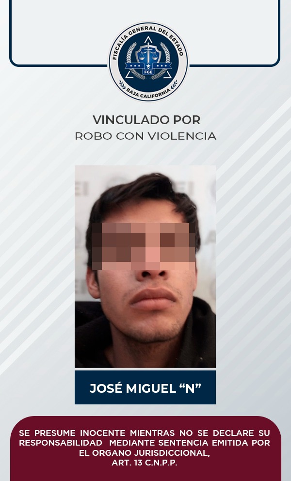 MEXICALI, B.C. La Fiscalía Regional de Mexicali, a través de la Unidad de Investigación con Detenidos Poniente, logró la vinculación de un hombre, presuntamente relacionado en un robo con violencia.