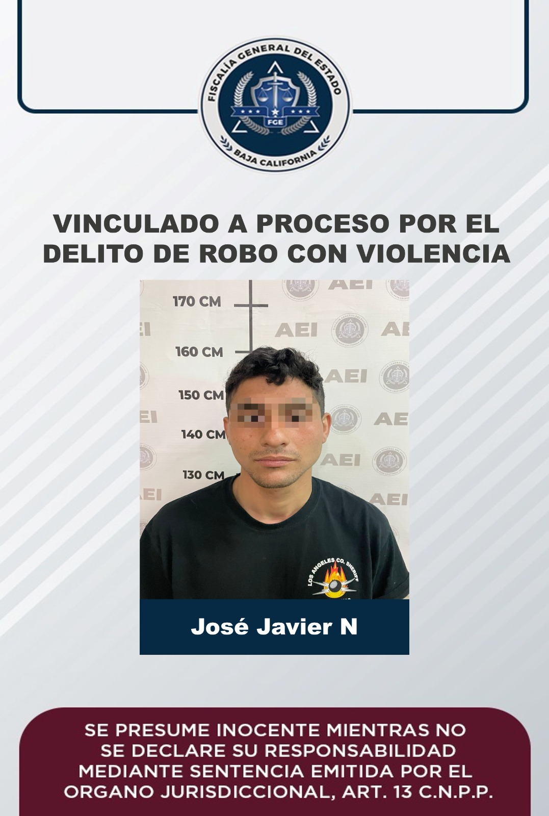 MEXICALI, B.C. La Fiscalía Regional de Mexicali, a través de la Unidad de Investigación de Delitos con Detenido Oriente obtuvo la vinculación a proceso en contra de José Javier “N” por presuntamente cometer el delito de robo con violencia.