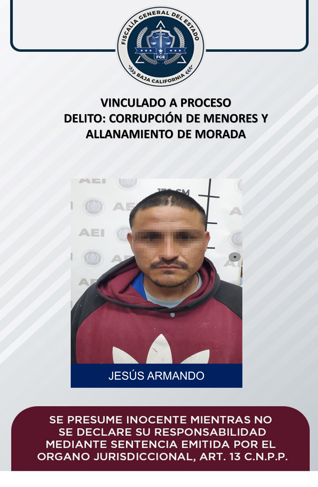 MEXICALI, B.C. 14 DE MARZO DE 2023.- La Fiscalía Regional de Mexicali, a través de la Unidad de Investigación de Delitos Foránea de Guadalupe Victoria, logró vincular a proceso y con la medida cautelar de prisión preventiva a un acusado de los delitos de corrupción de menores y allanamiento de morada.
