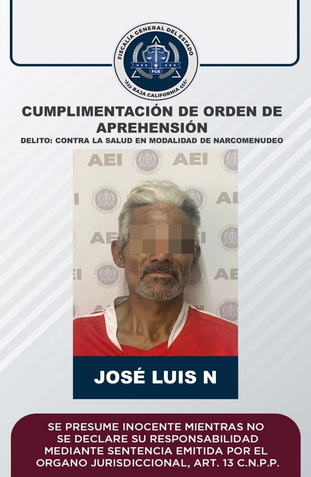 ENSENADA, B.C. Al contar con una orden de aprehensión vigente por narcomenudeo, en modalidad de posesión de metanfetamina, agentes de la Fiscalía General del Estado capturaron a José Luis “N”.