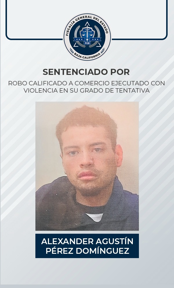 TIJUANA, B.C. La Fiscalía Regional de Tijuana acreditó la responsabilidad de Alexander Agustín Pérez Domínguez en el delito de robo calificado a comercio abierto al público ejecutado con violencia en su grado de tentativa.