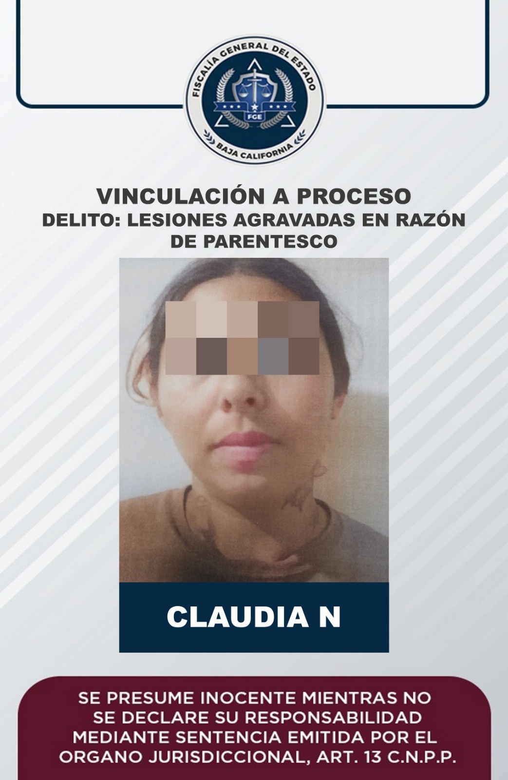 ENSENADA, B.C. Por el delito de lesiones agravadas en razón de parentesco, la Fiscalía Regional de Ensenada obtuvo auto de vinculación a proceso en contra de Claudia “N”, de 27 años de edad.