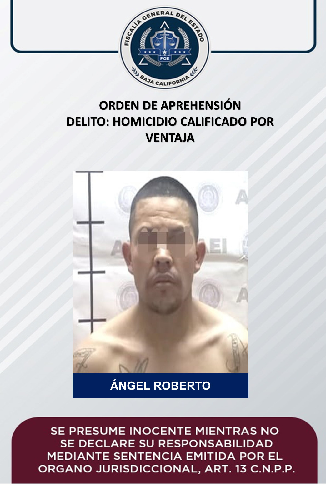 Después de determinar la probable participación de Ángel Roberto en el hecho que se investiga, se solicitó orden de aprehensión al Juez y una vez cumplimentada el detenido fue internado en el Centro de Detención Provisional (CEDEPRO), a disposición del Juez que llevará el proceso penal.