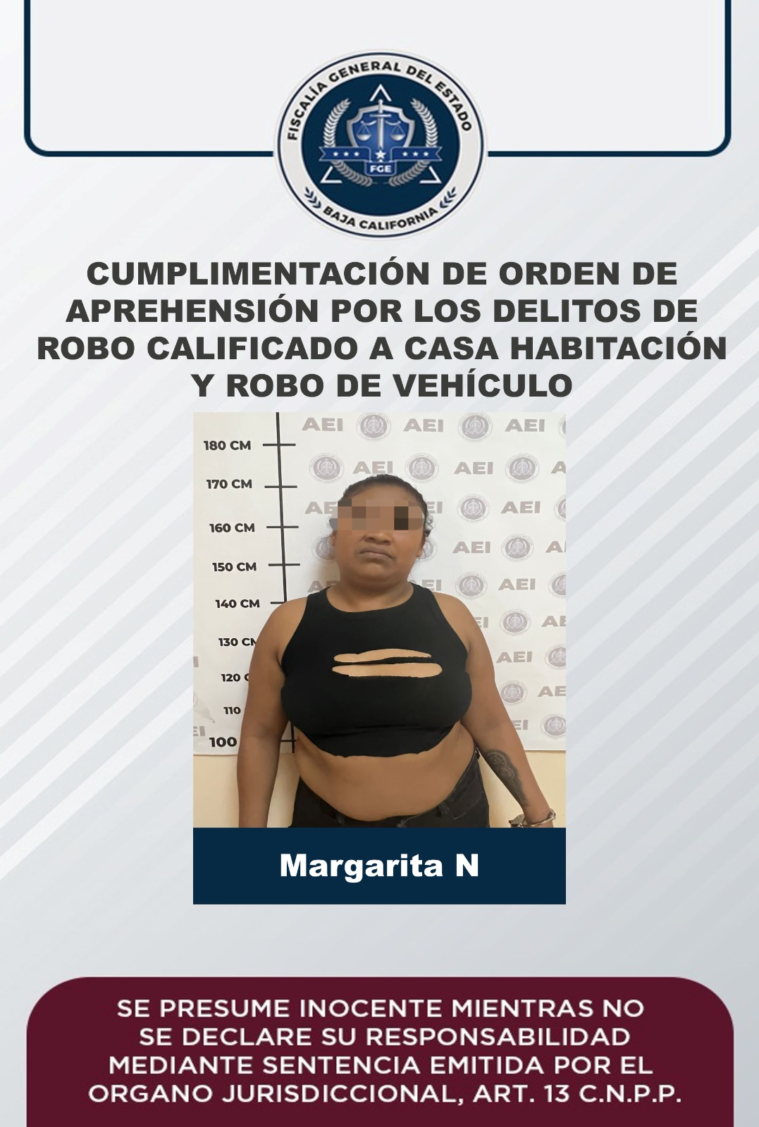 MEXICALI, B.C. La Fiscalía Regional de Mexicali, a través de elementos adscritos a la Agencia Estatal de Investigación, cumplimentaron una orden de aprehensión en contra de Margarita “N”, por los delitos de robo calificado a casa habitación y robo de vehículo de motor.
