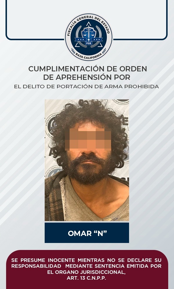 PLAYAS DE ROSARITO, B.C. Agentes pertenecientes al Grupo Especializado de Aprehensiones de la Fiscalía General del Estado, cumplimentaron un mandamiento judicial que pesaba en contra de Omar “N”, por el delito de portación de arma prohibida.