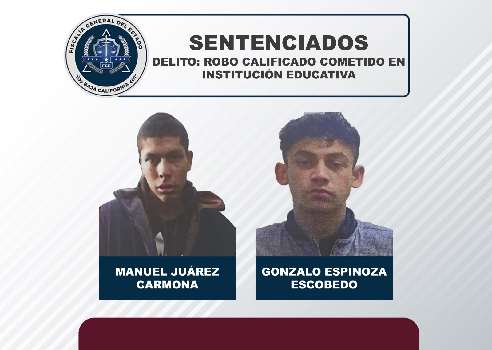 ENSENADA, B.C. La Fiscalía Regional de Ensenada logró sentencia contra dos sujetos por el delito de robo calificado cometido en una institución educativa localizada en el fraccionamiento Lomas de la Presa.