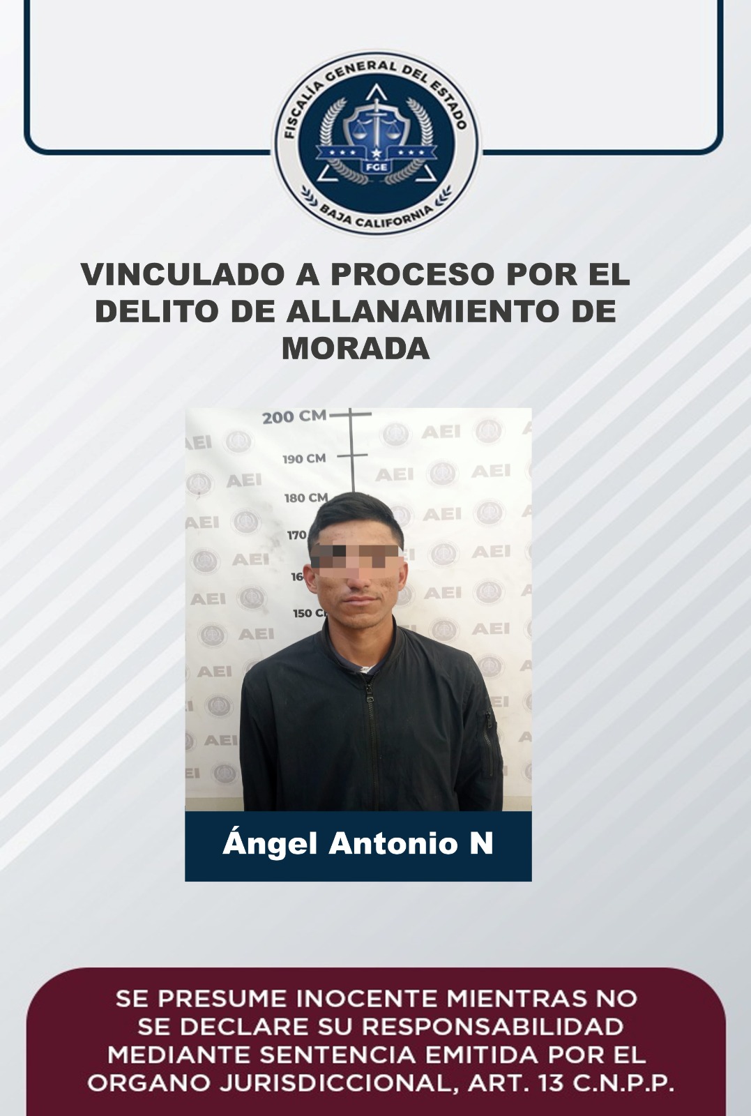 MEXICALI, B.C. La Fiscalía General del Estado, a través de la Unidad de Investigación de Delitos con Detenido Poniente, obtuvo la vinculación a proceso de Ángel Antonio “N” por el delito de allanamiento de morada.