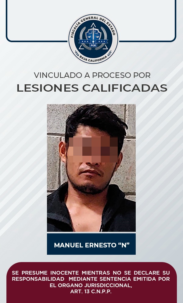 TIJUANA, B.C. La Fiscalía Regional de Tijuana, a través de las pruebas presentadas por el agente del Ministerio Público ante un Juez de Control, obtuvo la vinculación a proceso de Manuel Ernesto “N” por la probable comisión del delito de lesiones calificadas.