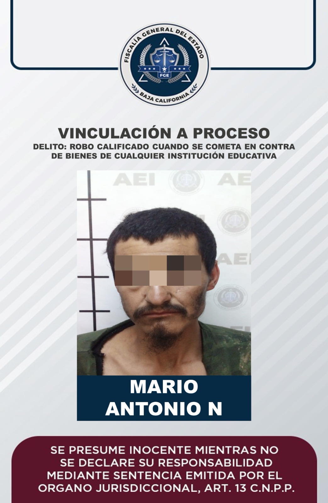 ENSENADA, B.C. Por el robo cometido en una primaria situada en la colonia Esperanza, la fiscalía Regional de Ensenada obtuvo la vinculación a proceso de Mario Antonio “N” de 26 años de edad.