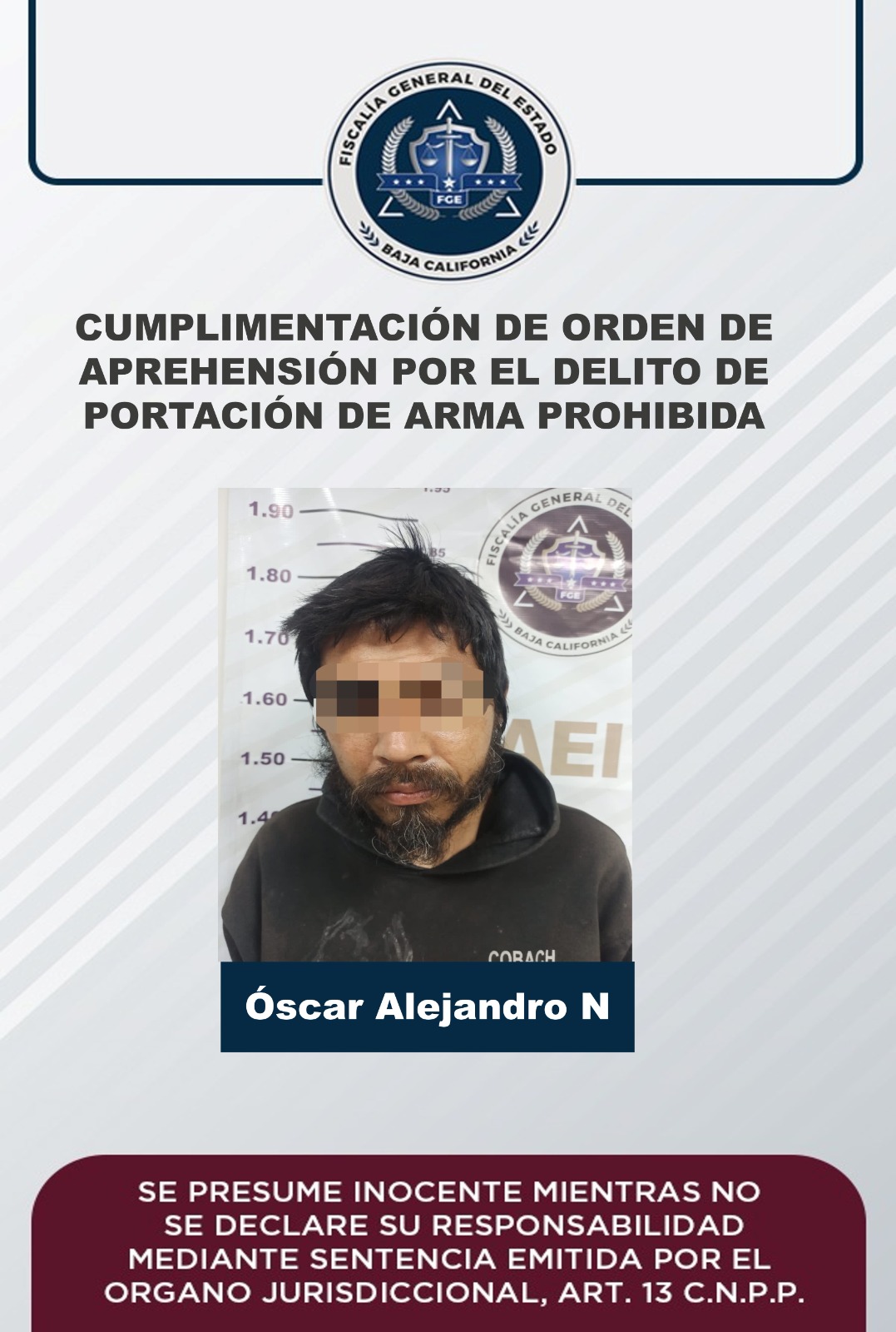 SAN FELIPE, B.C. La Fiscalía Regional de San Felipe, a través de la Unidad de Investigación Foránea, cumplimentó una orden de aprehensión en contra de Óscar Alejandro “N”, por el delito de portación de arma prohibida.