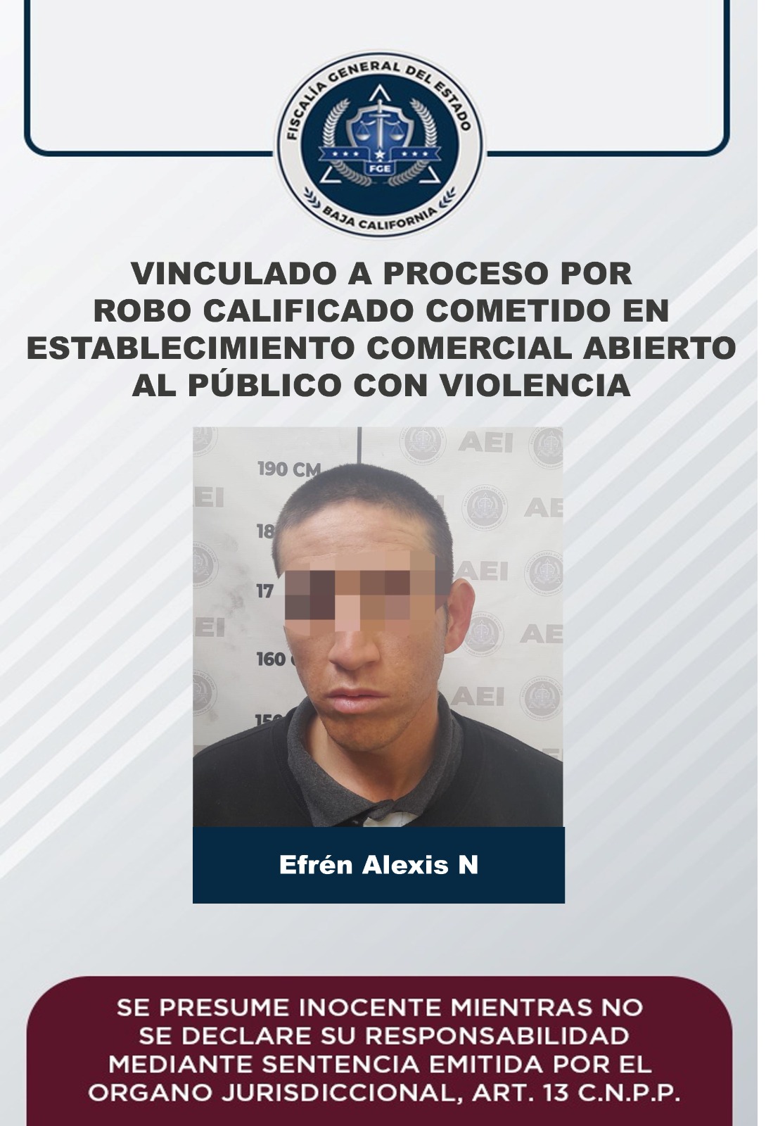 MEXICALI, B.C. La Fiscalía Regional de Mexicali, a través del trabajo realizado por la Unidad de Investigación de Delitos con Detenidos Poniente, obtuvo la vinculación a proceso en contra de Efrén Alexis “N”, por presuntamente cometer el delito de robo calificado a establecimiento comercial abierto al público con violencia.