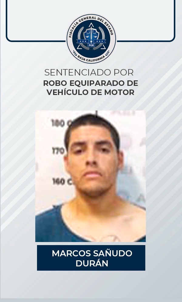 TIJUANA, B.C. Como resultado de una investigación por el delito de robo de vehículo de motor (usar vehículo de motor robado), la Fiscalía Regional de Tijuana obtuvo una sentencia para Marcos Sañudo Durán.