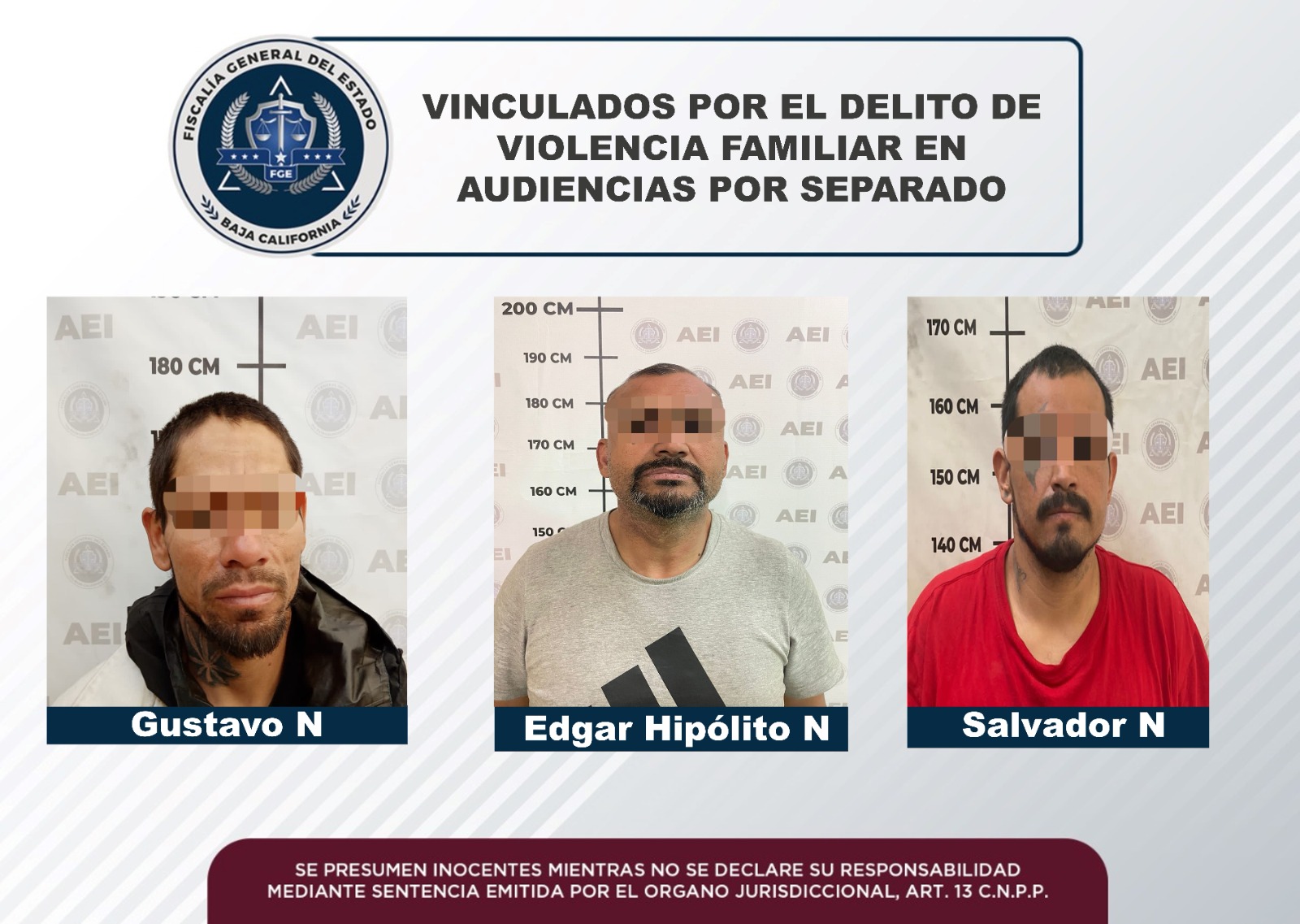 MEXICALI, B.C. La Fiscalía Regional de Mexicali, a través del trabajo realizado por las Unidades de Delitos con Detenidos Oriente y Poniente, logró como resultado de la integración de las carpetas de investigación, la vinculación a proceso de tres sujetos, por el delito de violencia familiar, en audiencias por separado.