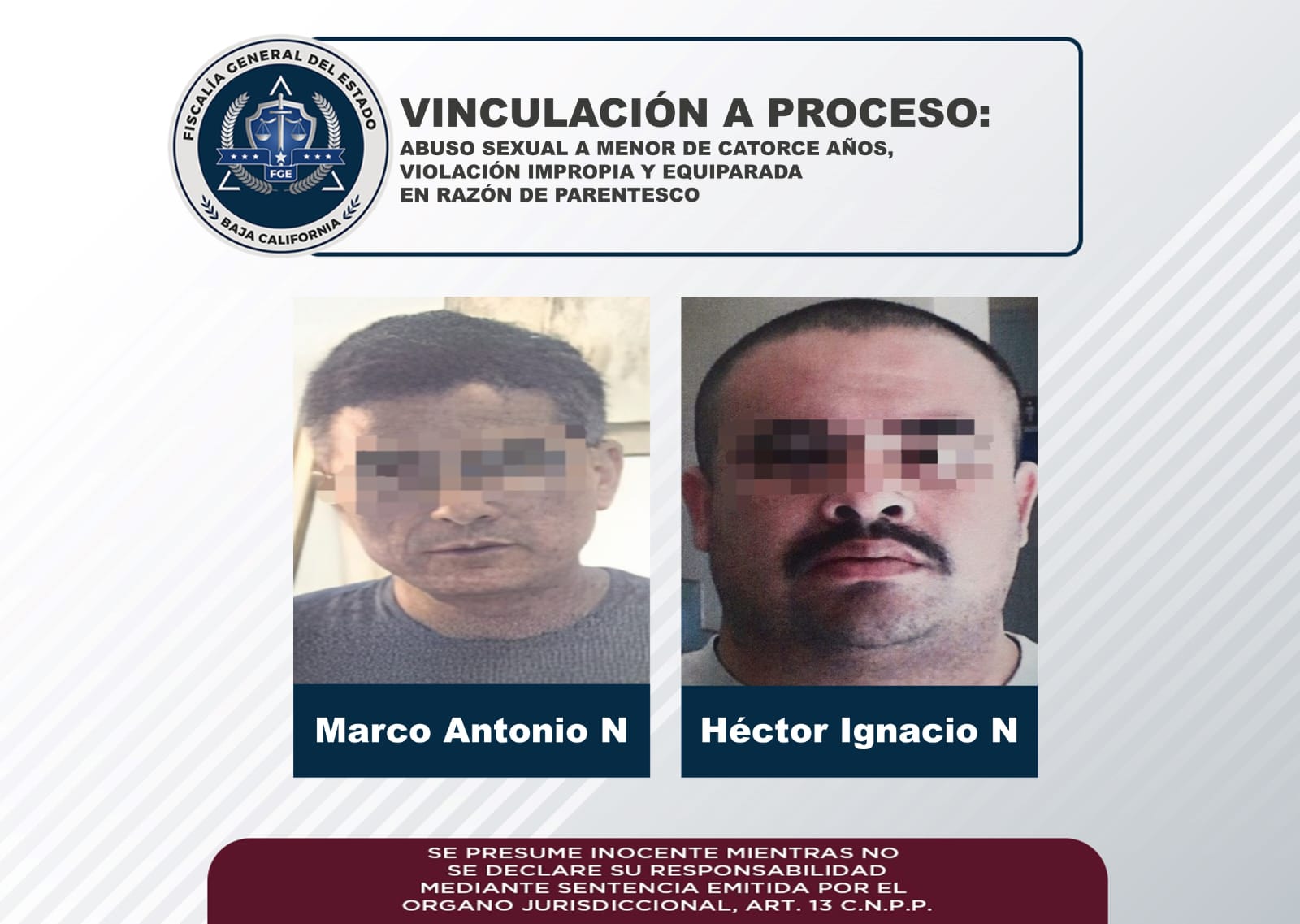 ENSENADA, B.C. La Fiscalía General del Estado (FGE), logró en distintas audiencias vinculación a proceso en contra de Marco Antonio “N” y Héctor Ignacio “N”, quienes, presuntamente, cometieron los delitos de abuso sexual a menor de catorce años, violación impropia y violación equiparada, ambos ilícitos, agravados por razón de parentesco.