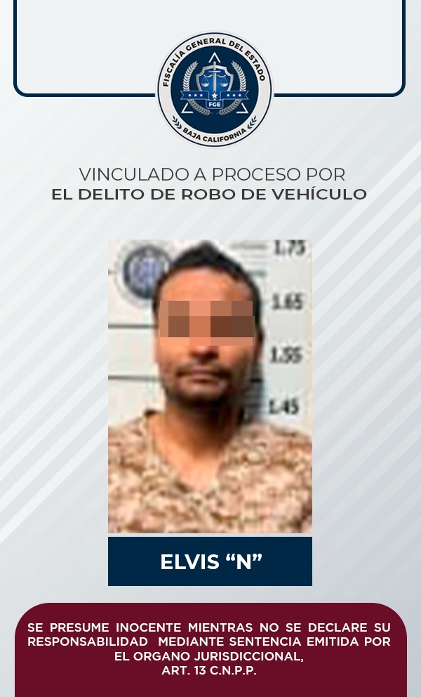 PLAYAS DE ROSARITO, B.C. Por el delito de robo de vehículo, en la modalidad de uso de vehículo de motor robado, un sujeto que responde al nombre de Elvis “N”, inició proceso penal, como parte de una investigación que desarrolla la Fiscalía Regional de Playas de Rosarito.