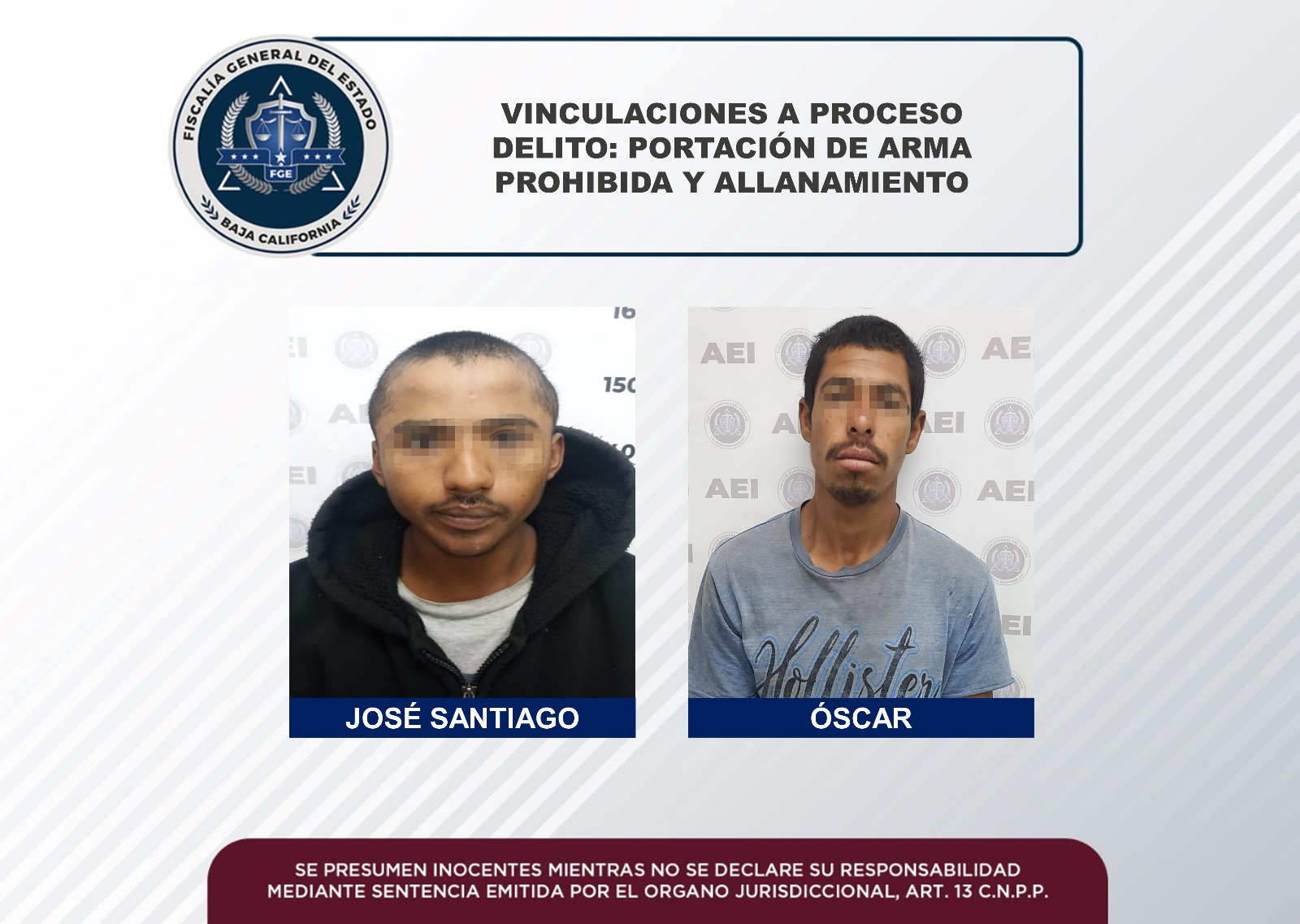 MEXICALI, B.C. La Fiscalía Regional de Mexicali, a través de la Unidad de Investigación Delitos Foránea de Guadalupe Victoria, logró en audiencias por separado, el inicio del proceso penal de dos acusados por los delitos de portación de arma prohibida y allanamiento de morada.