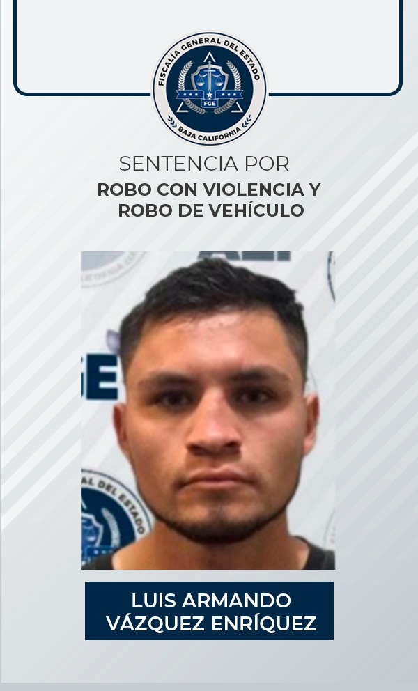 TIJUANA, B.C. Como resultado de una investigación por los delitos de robo con violencia y robo de vehículo, la Fiscalía Regional del Tijuana obtuvo una sentencia condenatoria para Luis Armando Vázquez Enríquez.