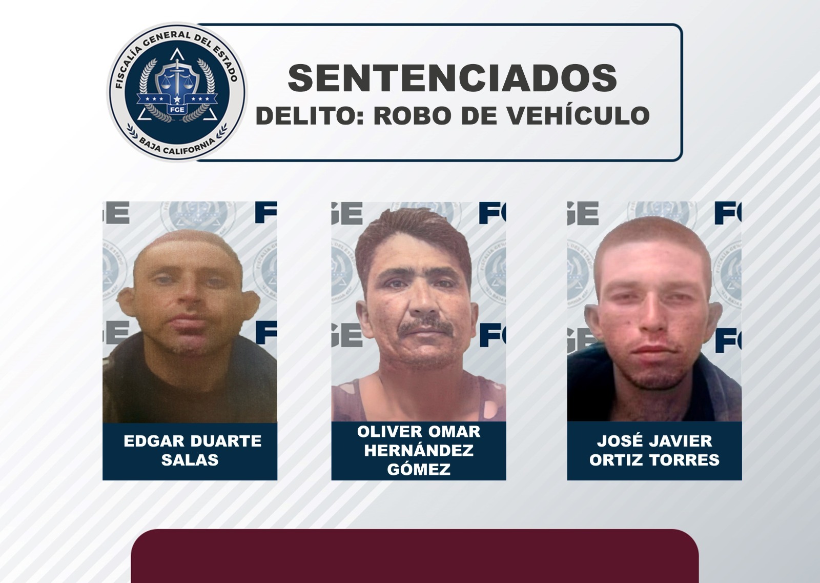 ENSENADA, B.C. La Fiscalía Regional de Ensenada, a través de procedimientos abreviados, obtuvo sentencias condenatorias, en tres casos distintos, por el delito de robo de vehículo en diversas modalidades.