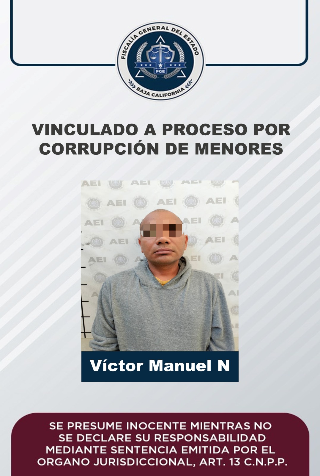 MEXICALI, B.C. La Fiscalía General del Estado, a través del trabajo realizado por la Fiscalía Especializada en Delitos Contra la Mujer por Razón de Género, logró que Víctor Manuel “N” enfrente un juicio penal por el delito de corrupción de menores.