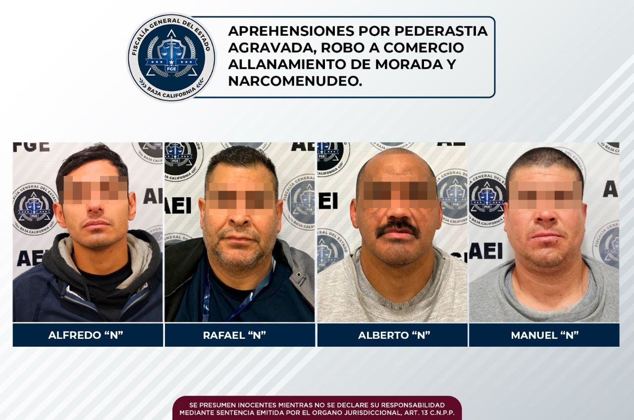 Se trata de cuatro hombres, los cuales están como presuntos responsables en carpetas de investigación elaboradas por el Ministerio Público de las fiscalías Regionales de Tijuana, especializada en Narcomenudeo y la Especializada en Delitos Contra la Mujer por Razón de Género.