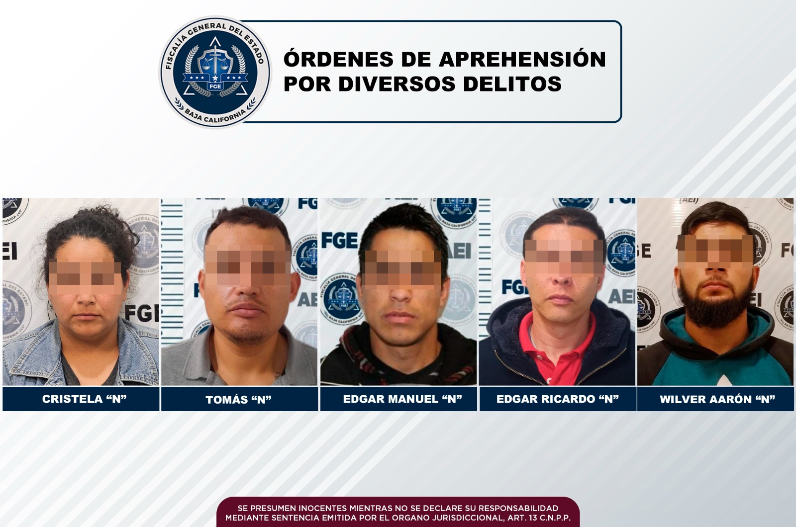 TIJUANA, B.C. MEDIANTE labores de investigación e inteligencia desarrolladas por agentes estatales de investigación de la Fiscalía General del Estado, se logró la cumplimentación de cinco órdenes de aprehensión en contra de personas que tenían cuentas pendientes con la justicia, por lo que deberán responder ante un juez por el delito que se le imputa.