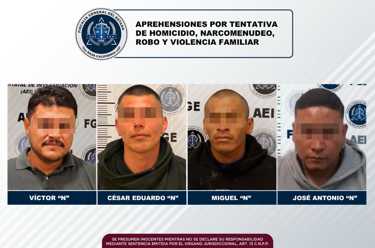 TIJUANA, B.C. La Fiscalía General del Estado, a través de la Agencia Estatal de Investigación, logró la cumplimentación de cuatro órdenes de aprehensión en contra de igual número de sujetos que eran requeridos por jueces de control, por tener señalamientos en su contra por diversos delitos.