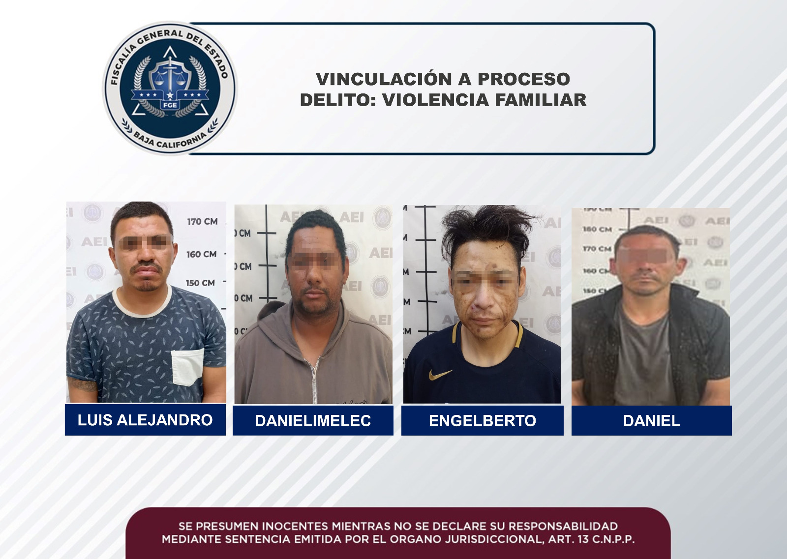 MEXICALI, B.C. Cuatros acusados del delito de violencia familiar fueron vinculados a proceso, con base a los elementes de prueba presentados por la Fiscalía Regional de Mexicali, a través de la Unidad de Investigación Foránea de Guadalupe Victoria y las Unidades de Investigación con Detenidos Poniente y Detenidos Oriente.