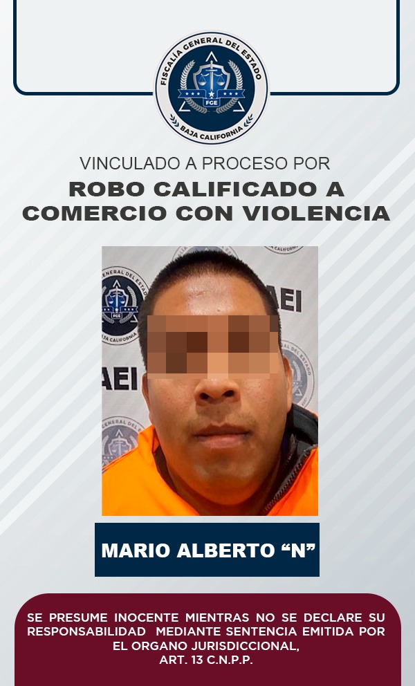 TIJUANA, B.C. Datos de prueba aportados por la Fiscalía Regional de Tijuana, permitieron que, en audiencia un Juez de Control vinculara a proceso a un sujeto que responde al nombre de Mario Alberto “N”, por ser probable responsable del delito de robo calificado a comercio con violencia.