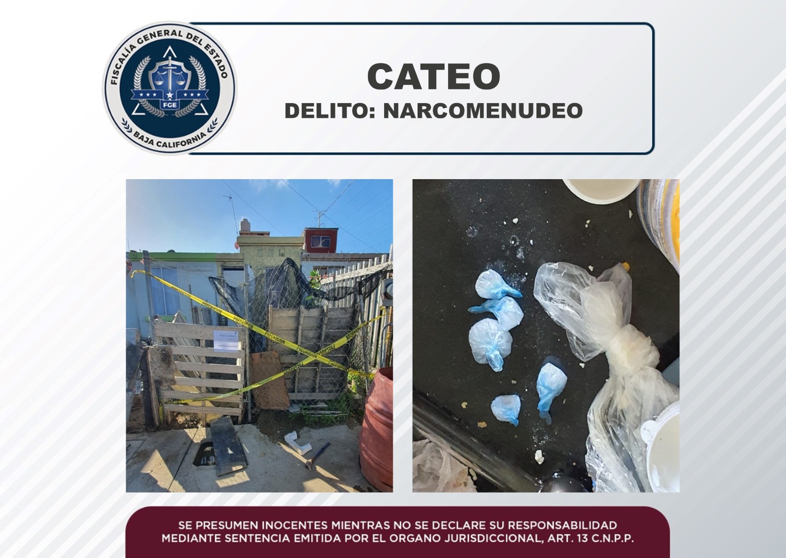 ENSENADA, B.C. Continuando con acciones para el combate al delito de narcomenudeo en la región, la Fiscalía General del Estado (FGE), aseguró droga y un predio en el fraccionamiento El Roble, tras cumplimentar una orden de cateo.