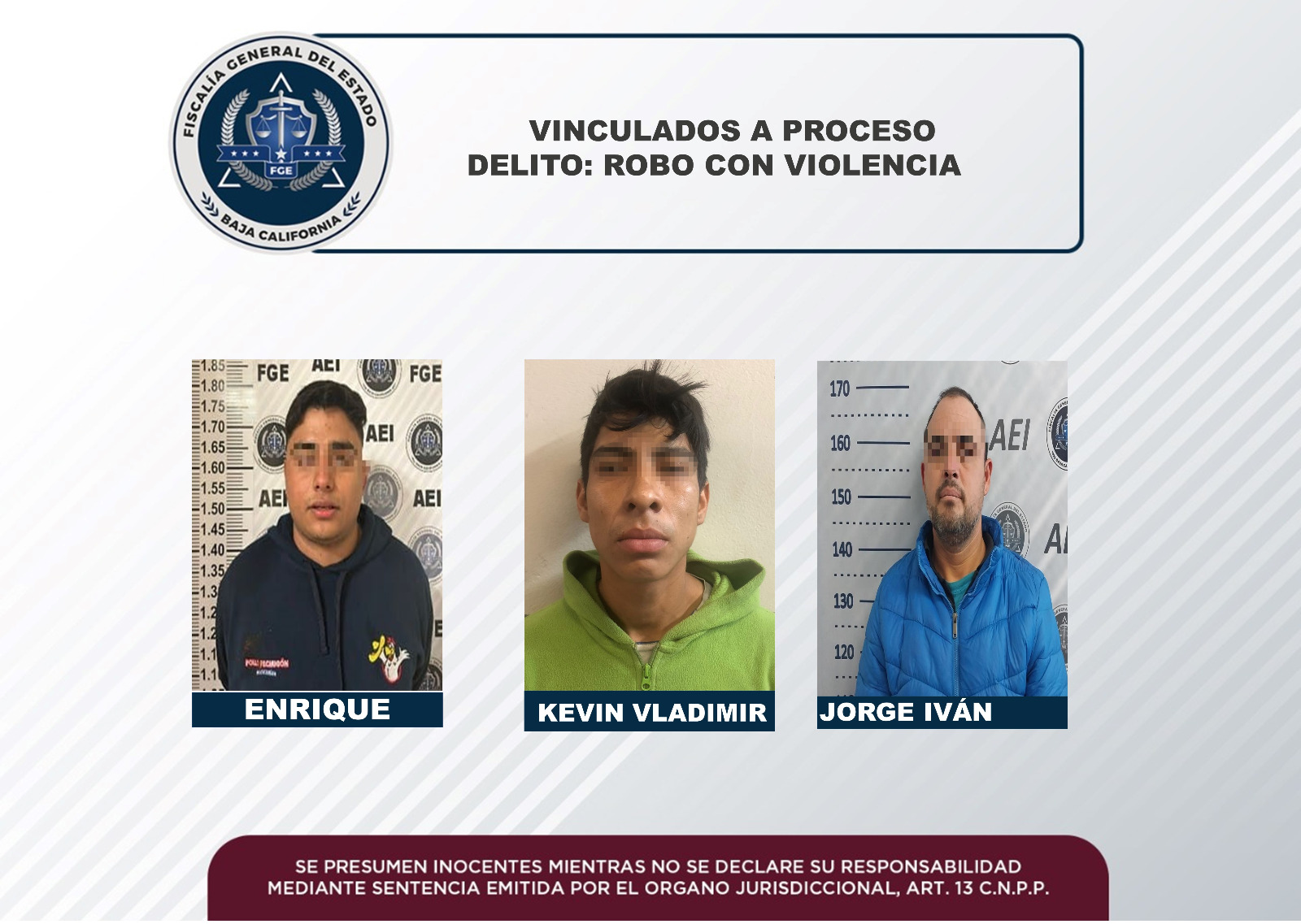 MEXICALI, B.C. La Fiscalía Regional de Mexicali a través de la Unidad de Investigación de Robos Poniente, obtuvo la vinculación a proceso de tres hombres presuntamente relacionados en la comisión de robos con violencia.