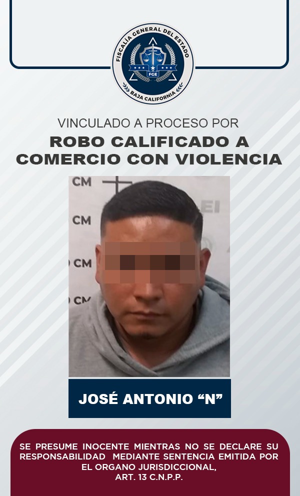 TIJUANA, B.C. Por la probable comisión del delito de robo calificado a comercio con violencia, un sujeto de nombre José Antonio “N” fue vinculado a proceso, esto tras las pruebas aportadas por el agente del Ministerio Público de la Fiscalía Regional de Tijuana ante la autoridad juzgadora.