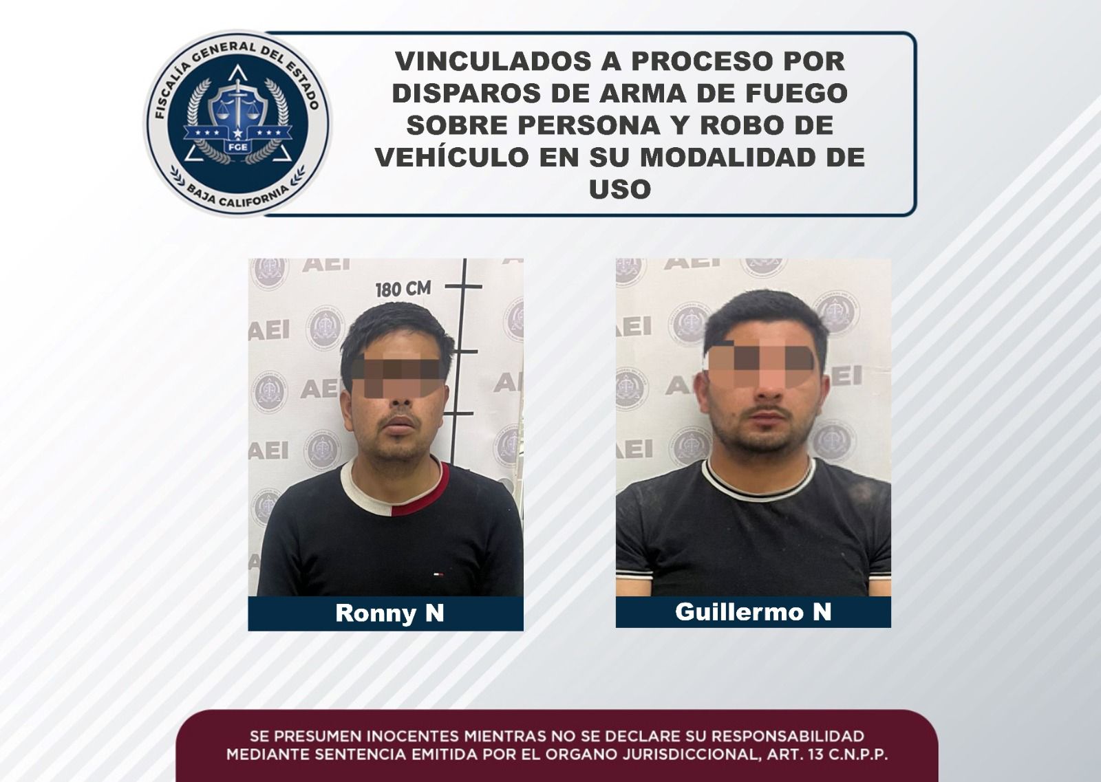 MEXICALI, B.C. La Fiscalía Regional de Mexicali, como resultado del trabajo realizado por la Unidad de Investigación Foránea de Guadalupe Victoria, logró la vinculación a proceso de Ronny “N” y Guillermo “N”, por presuntamente cometer los delitos de disparos de arma de fuego sobre persona y robo de vehículo en su modalidad de uso.