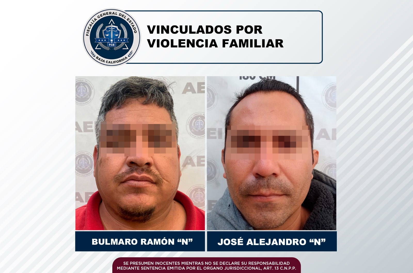 MEXICALI, B.C. La Fiscalía Regional de Mexicali, a través de la Unidad de Investigación con Detenidos Poniente, logró con base a las pruebas y argumentos presentados, la vinculación a proceso de dos imputados por el delito de violencia familiar.