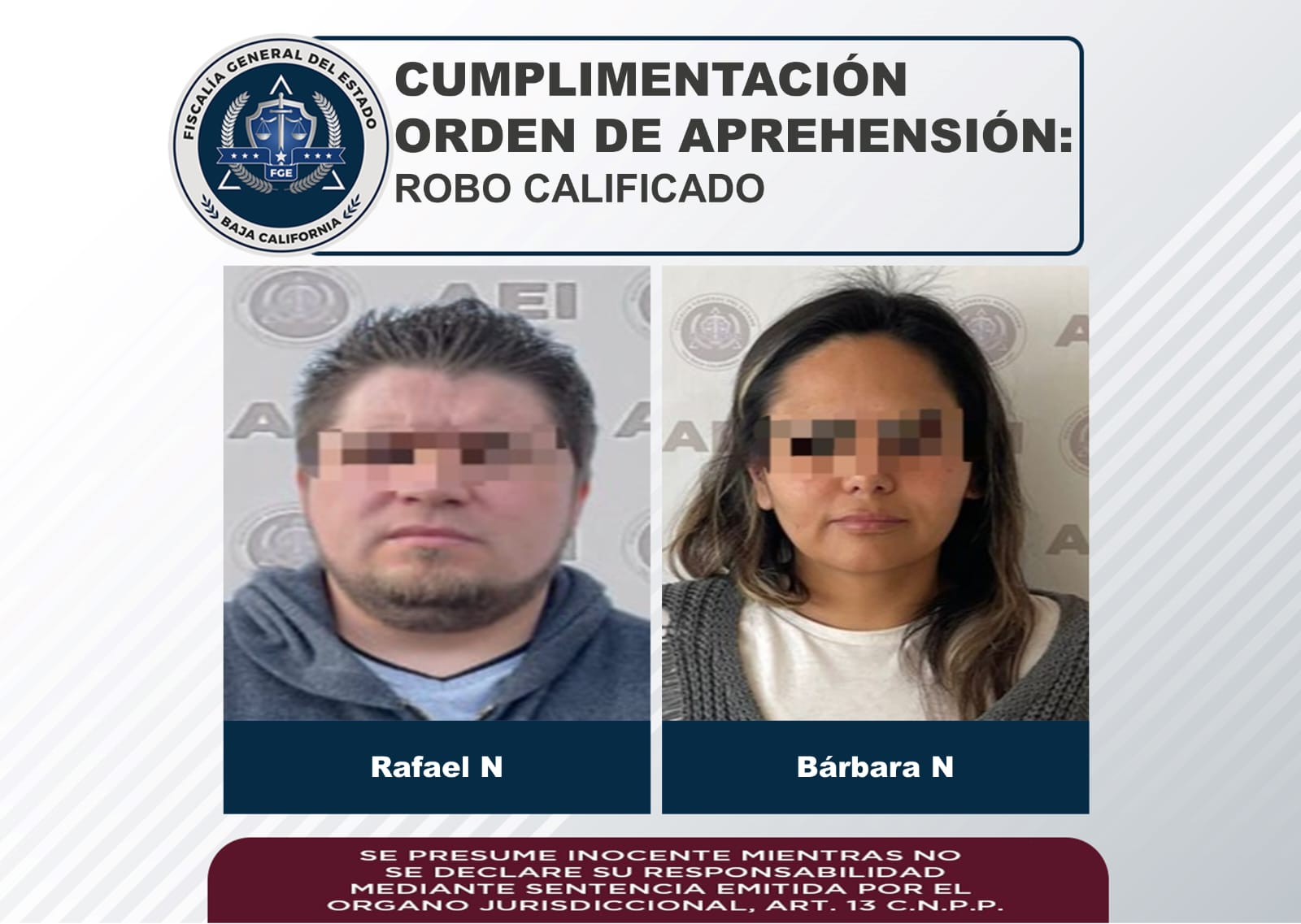 ENSENADA, B.C. La Fiscalía General del Estado (FGE), cumplimentó mandatos judiciales que pesaban en contra de Rafael “N” y Bárbara “N”, ambos de 29 años de edad, por su posible responsabilidad en el robo de cuatro equipos de uso marítimo con valor estimado de 216 mil pesos.