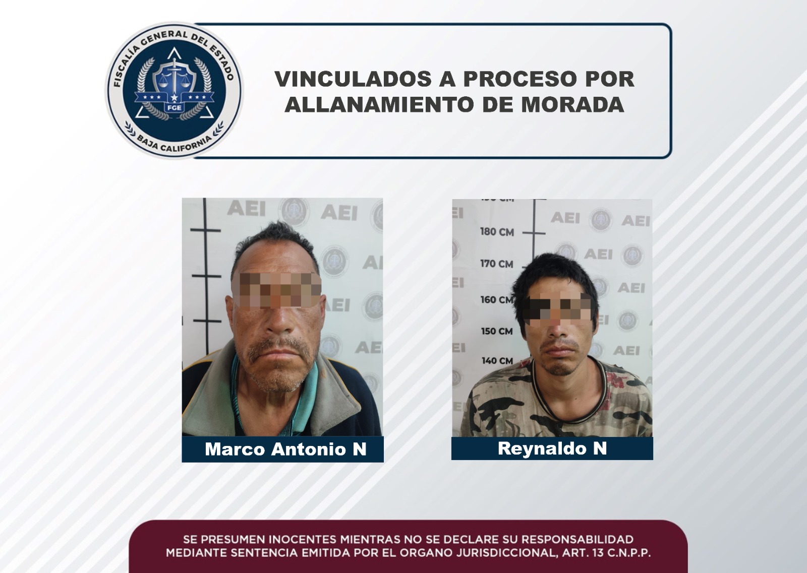 MEXICALI, B.C. 08 DE ABRIL DE 2023.- La Fiscalía General del Estado, a través de la Unidad de Investigación de Delitos con Detenido Oriente, obtuvo la vinculación a proceso de Marco Antonio “N” y Reynaldo “N”, por el delito de allanamiento de morada.