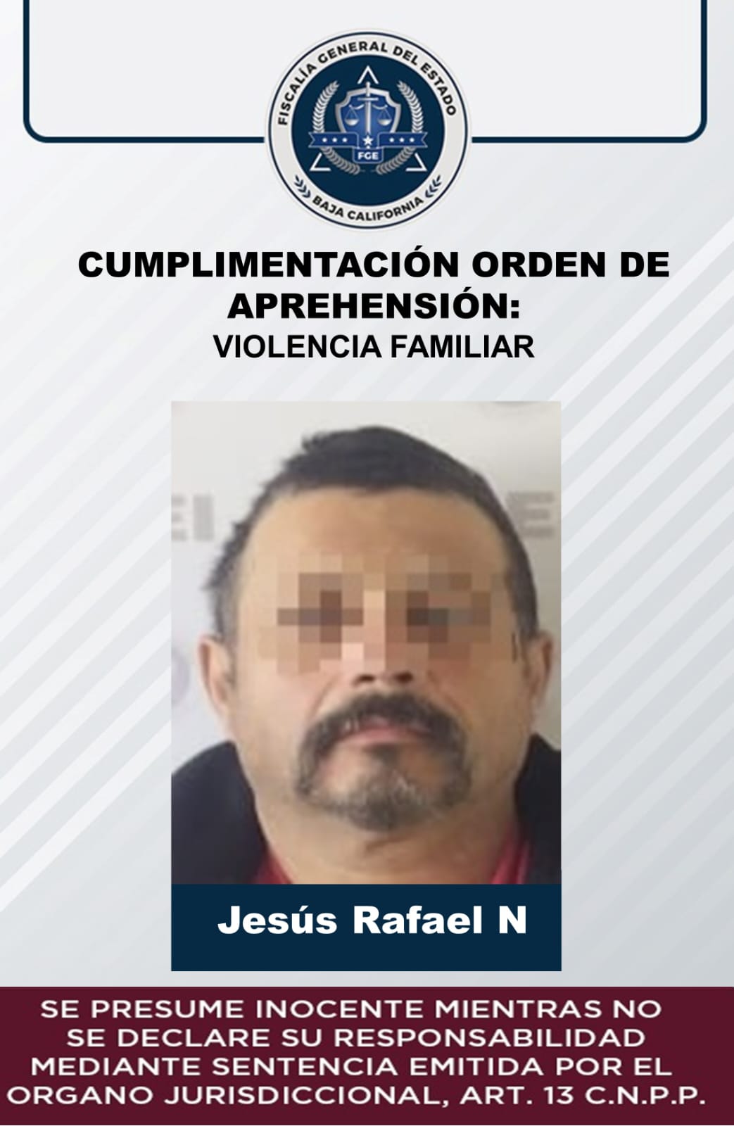 ENSENADA, B.C. Por el delito de violencia familiar, elementos de la Fiscalía General de Baja California, cumplimentaron un mandato judicial en contra de Jesús Rafael “N”, de 47 años de edad.