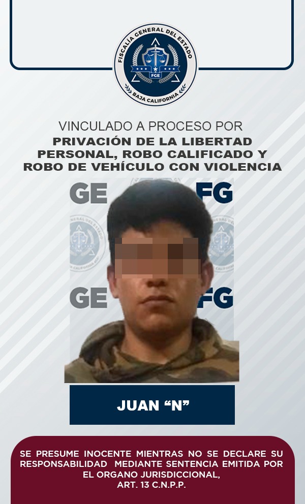 TIJUANA, B.C. La Fiscalía Regional de Tijuana informa que, derivado de los datos de prueba presentados por el Ministerio Público, se logró que un Juez de Control determinara vincular a proceso a Juan “N”, por ser probable responsable de los delitos de privación de la libertad personal agravada, robo calificado cometido por dos o más personas de noche ejecutado con violencia y robo de vehículo con violencia.