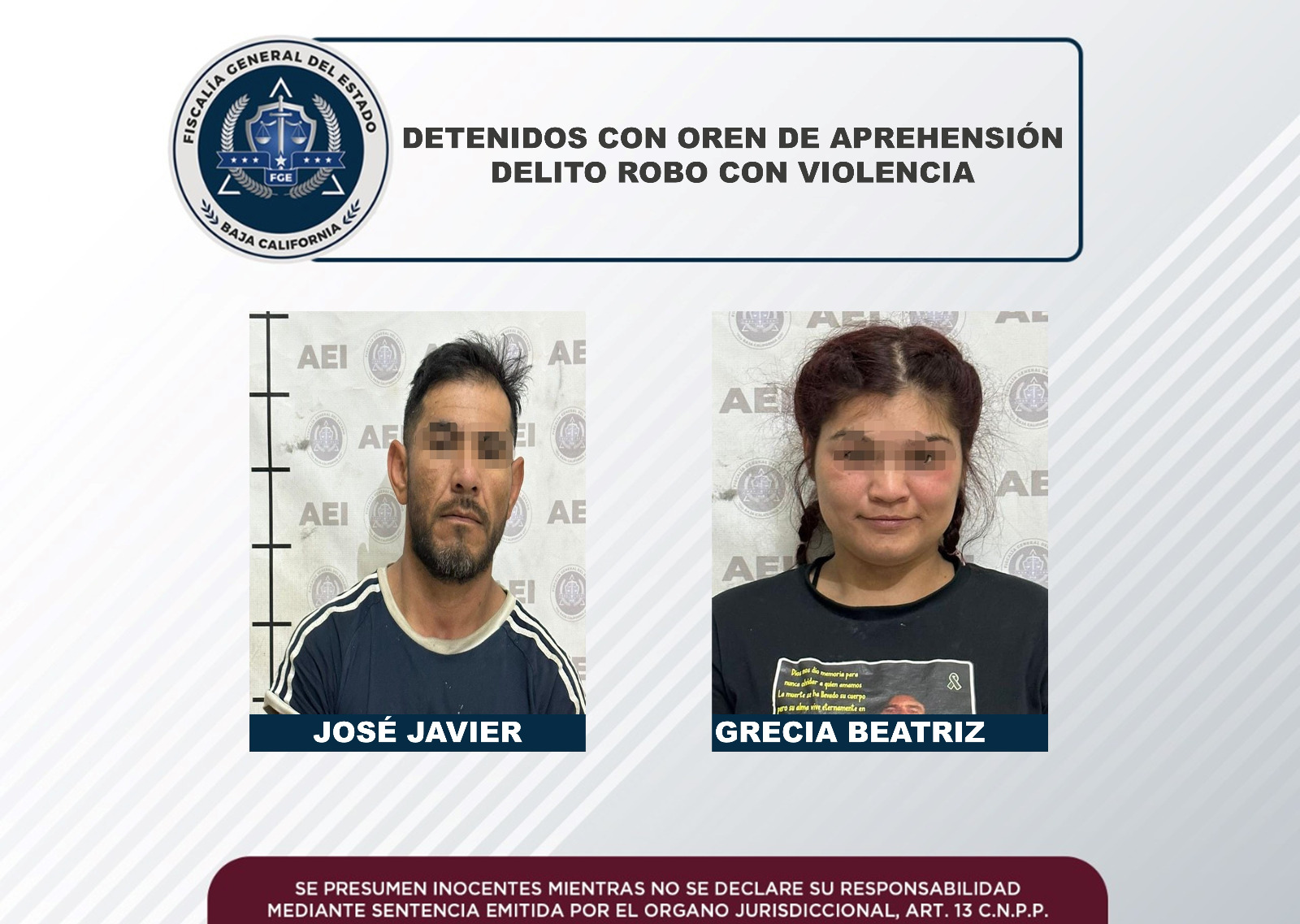 MEXICALI, B.C. Elementos de la Agencia Estatal de Investigación (AIE), cumplimentaron orden de aprehensión a una pareja que era buscada por el delito de robo calificado, cometido por dos o más personas con violencia.