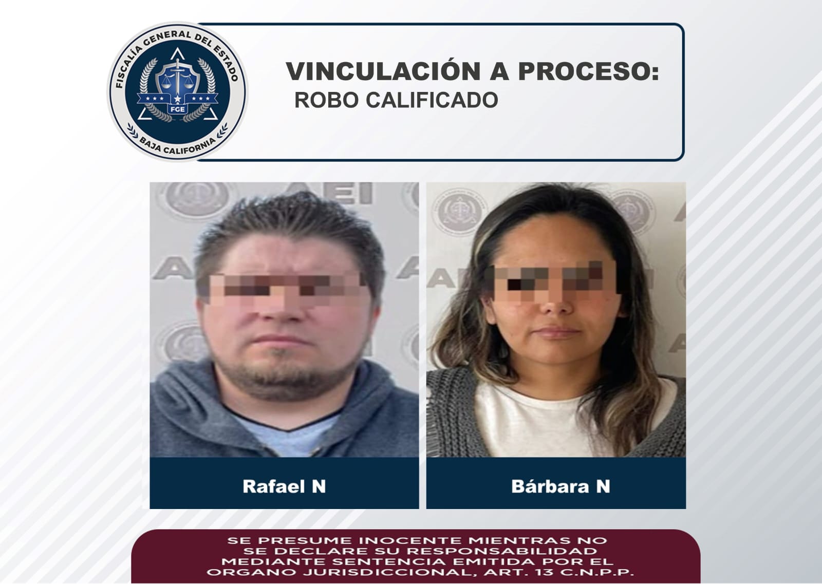 ENSENADA, B.C. Mediante datos de prueba presentados por la Fiscalía Regional de Ensenada, se logró la aprehensión y vinculación a proceso de Rafael “N” y Bárbara “N”, ambos de 29 años de edad, investigados por el delito de robo calificado cometido por dependiente.