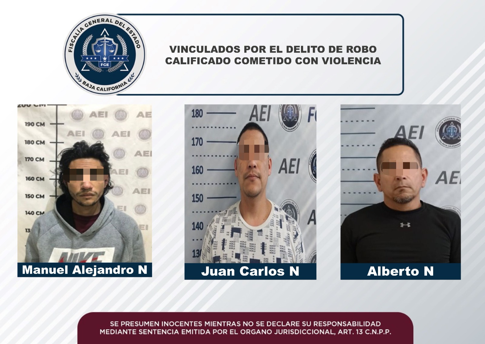 MEXICALI, B.C. Con base en datos y argumentos presentados por la Unidad de Investigación de Delitos con Detenidos Poniente, de la Fiscalía Regional de Mexicali obtuvo la vinculación a proceso de tres hombres, en audiencia por separado.