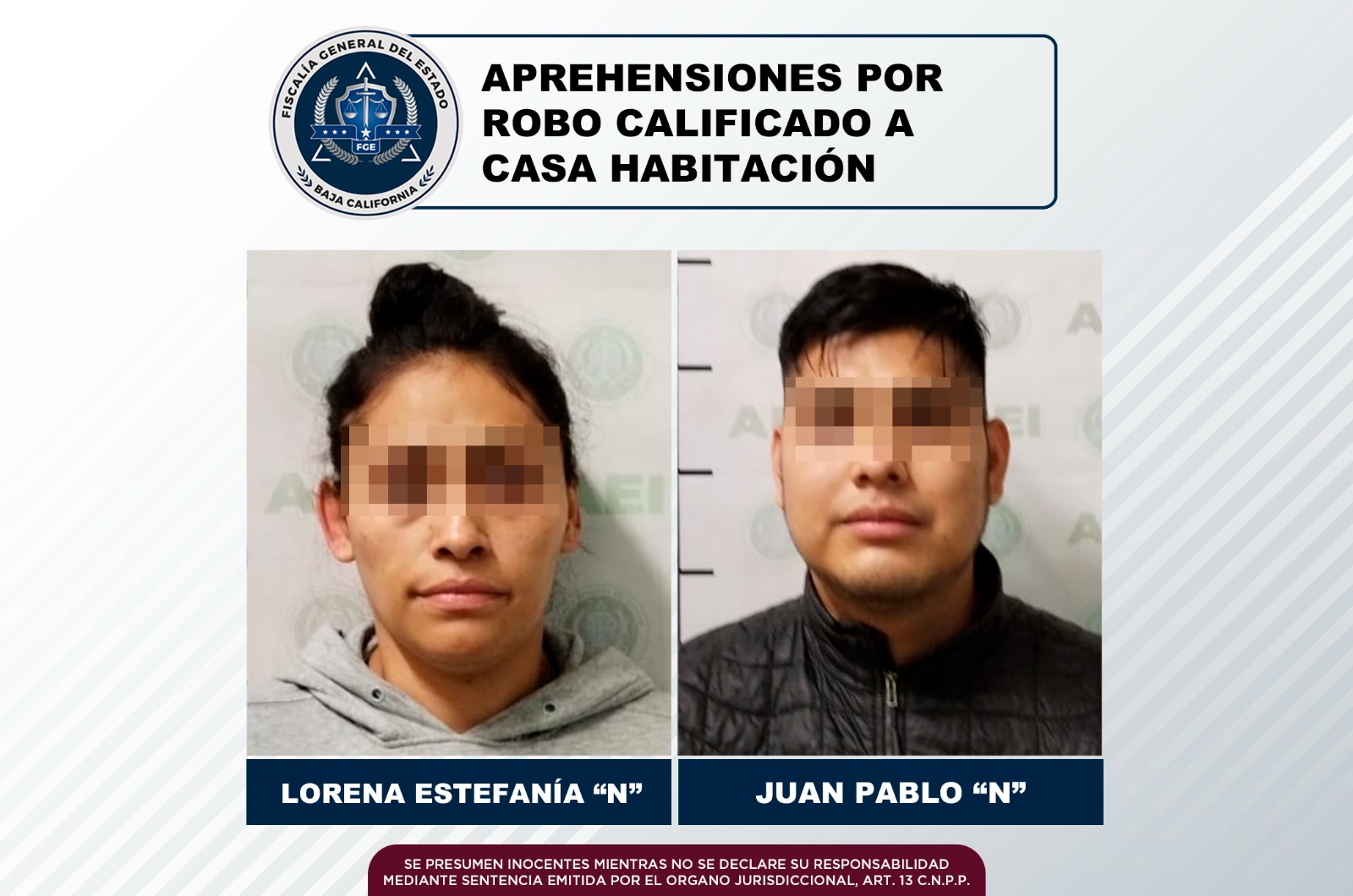 TIJUANA, B.C. La Fiscalía General del Estado, a través de la Unidad de Aprehensiones de la Agencia Estatal de Investigación, logró la detención de dos personas, hombre y mujer, quienes en casos diferentes contaban con orden de aprehensión por el delito de robo calificado a casa habitación, cometido por dos o más personas.