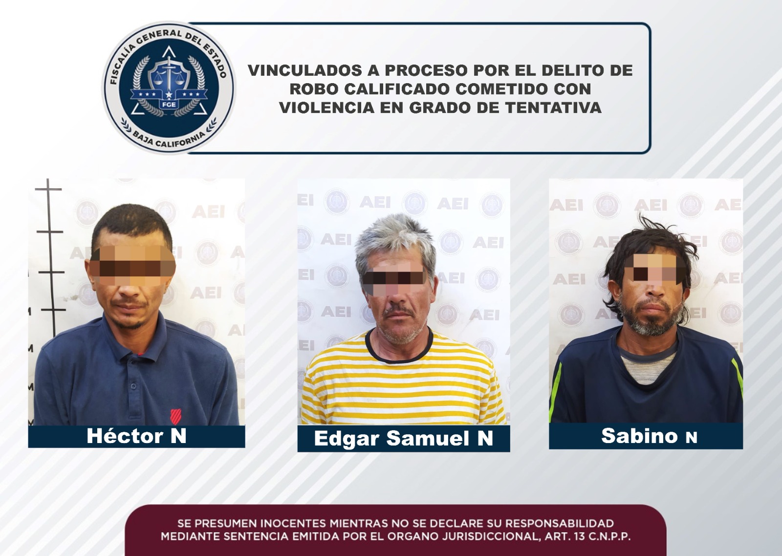 MEXICALI, B.C. La Fiscalía Regional del Mexicali obtuvo la vinculación a proceso de Edgar Samuel “N”, Sabino “N” y Héctor “N”, por el delito de robo calificado a establecimiento comercial abierto al público cometido con violencia en grado de tentativa.
