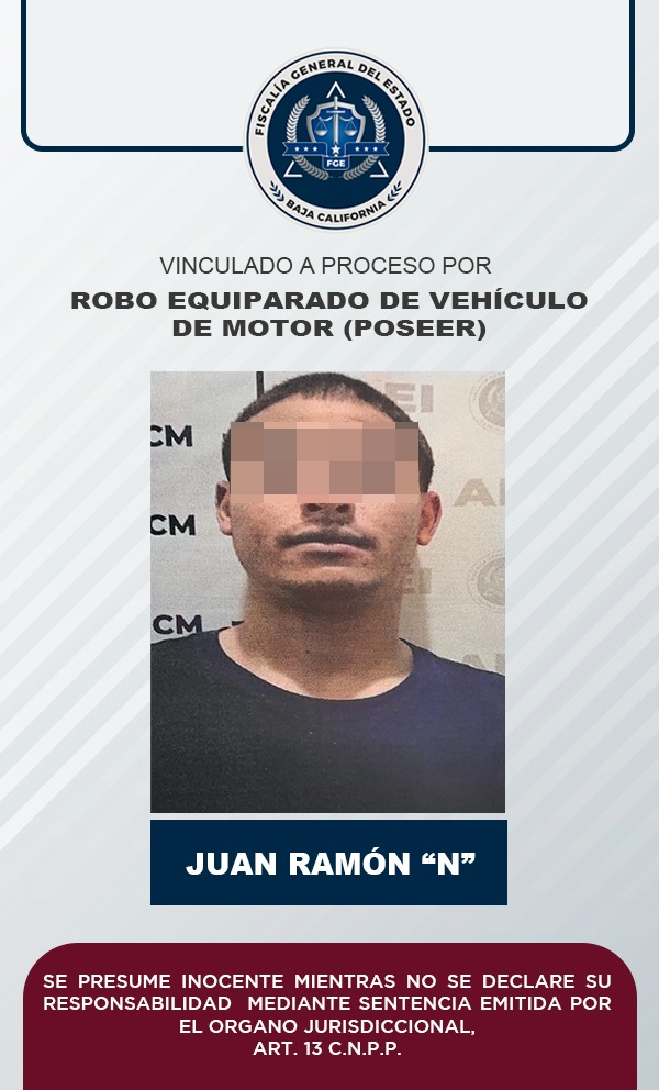 TIJUANA, B.C. La Fiscalía Regional de Tijuana, a través de los elementos de prueba presentados por el agente del Ministerio Público, logró que fuera vinculado a proceso el de nombre Juan Ramón “N”, por la probable comisión del delito de robo equiparado de vehículo de motor en su modalidad de poseer vehículo de motor robado.