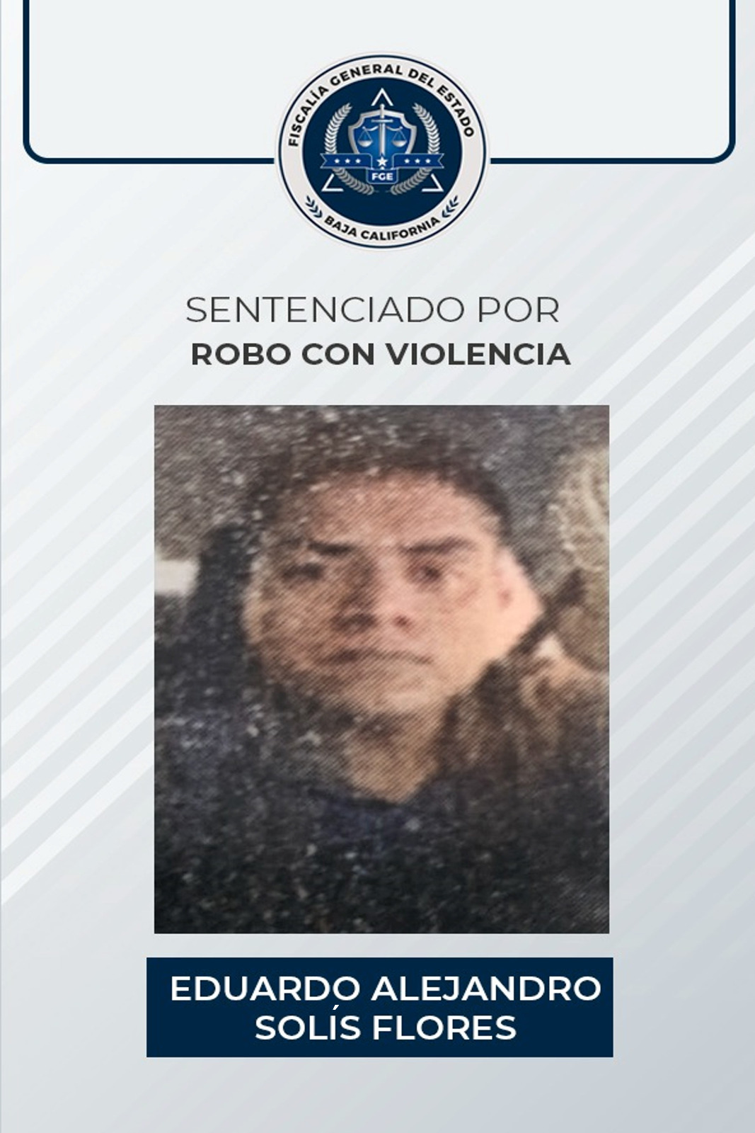 TIJUANA, B.C. La Fiscalía Regional de Tijuana, a través del agente Ministerio Público, obtuvo en un procedimiento abreviado una sentencia de cuatro años de prisión contra Eduardo Alejandro Solís Flores, por resultar penalmente responsable del delito de robo con violencia, el cual cometió el 27 de enero de 2021.