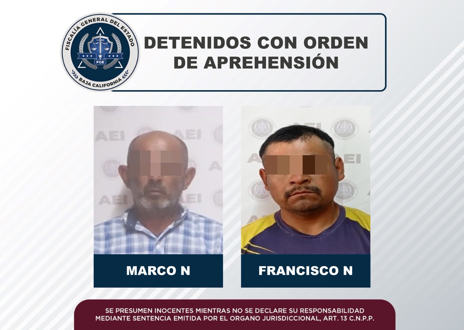 ENSENADA, B.C. La Fiscalía General de Baja California cumplimentó ordenes de aprehensión contra dos prófugos de la justicia; en uno de los casos al detenido se le investiga por el delito de violación y fue capturado en el estado de Baja California Sur.