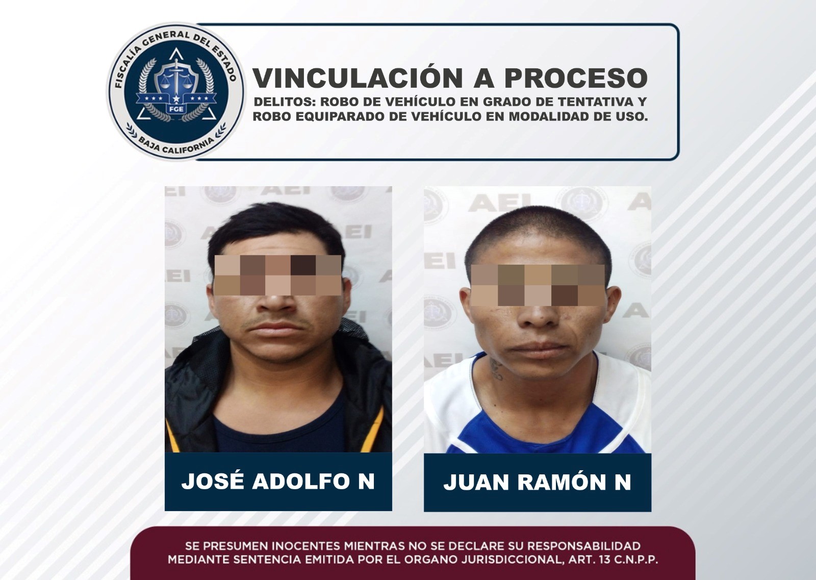 ENSENADA, B.C. La Fiscalía Regional de Ensenada obtuvo la vinculación a proceso de dos hombres que, en distintos hechos, fueron detenidos el 10 de abril de este año, por el delito de robo de vehículo en grado de tentativa y robo equiparado de vehículo en modalidad de uso.