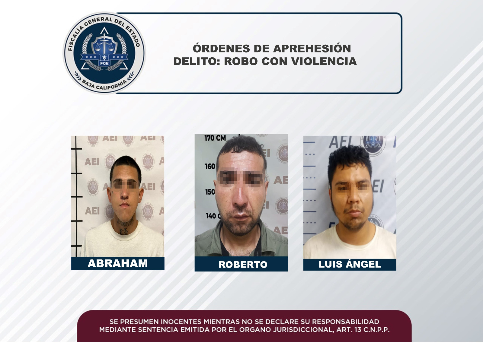 MEXICALI, B.C. Tres hombres relacionados en diversos robos cometidos en distintas partes de la ciudad, fueron detenidos por elementos de la Fiscalía General del Estado (FGE), al cumplimentarles orden de aprehensión.