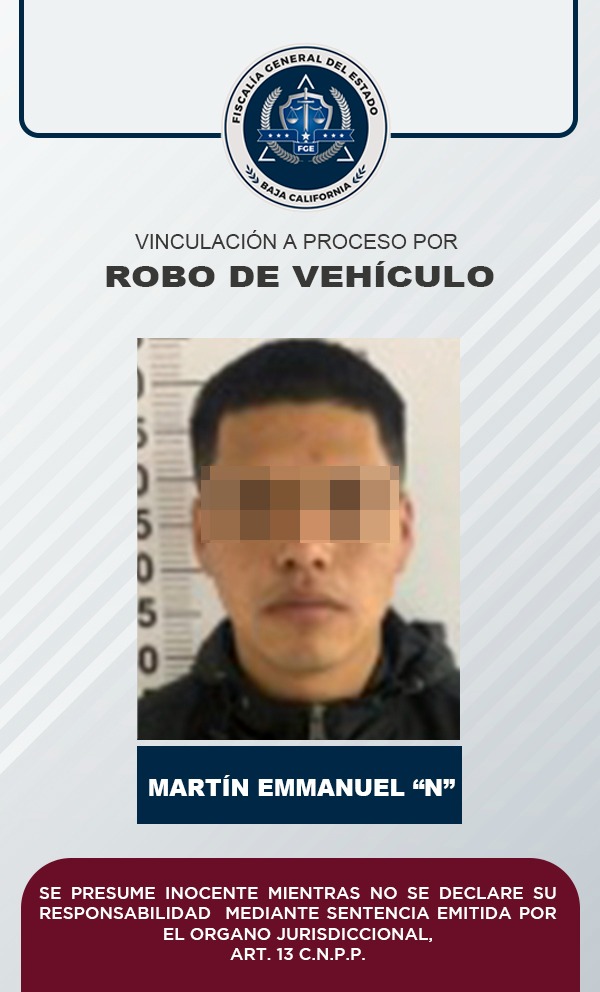 PLAYAS DE ROSARITO, B.C. Datos de prueba proporcionados por la Fiscalía Regional de Playas de Rosarito, permitieron que un sujeto que responde al nombre de Martín Emmanuel “N”, iniciara proceso penal por el delito de robo equiparado de vehículo de motor (usar vehículo de motor robado), por hechos registrados en junio de 2022 en Playas de Rosarito.