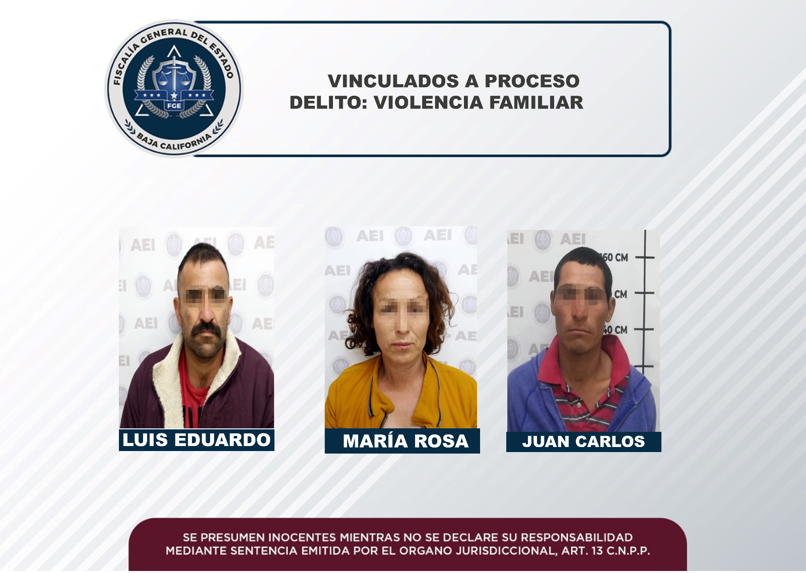 MEXICALI, B.C. Tres personas relacionadas en el delito de violencia familiar, fueron vinculadas a proceso, con base a los elementos de prueba presentados por la Fiscalía Regional de Mexicali, a través de la Unidad de Investigación Foránea de Guadalupe Victoria.