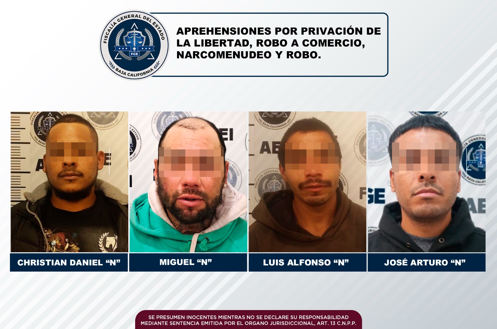 TIJUANA, B.C. Elementos policiacos de la Fiscalía General del Estado, cumplimentaron cuatro órdenes de aprehensión, en contra de sujetos acusados, en casos por separado, de los delitos de privación de la libertad personal, robo, robo a comercio y narcomenudeo.